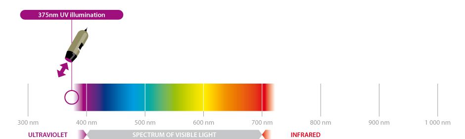 VW-serien har två typer av LED-lampor som kan växlas mellan vitt och UV-ljus. Denna modell har ett filter för att filtrera bort det återkommande UV-ljuset så att en bild med naturliga färger kan erhållas.