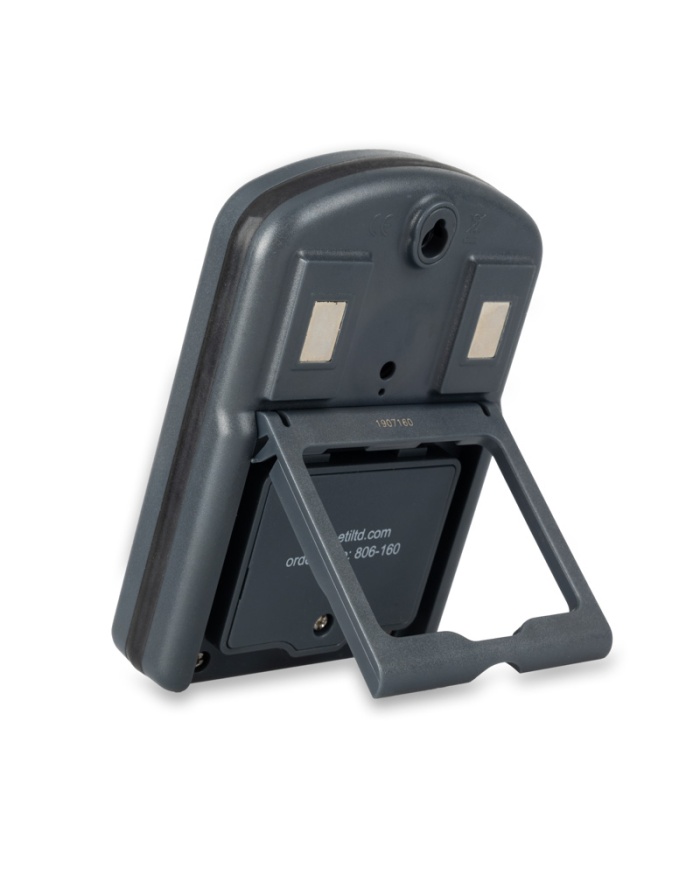 När ett nedräkningslarm ljuder startar uppräkningstimern så att du ser hur lång tid som går efter att ditt larm har ställts in. Minnet behåller din senaste nedräkningsinställning. Timern innehåller två magnetiska kuddar, ett utfällbart stativ. Timern mäter 28 x 90 x 130 mm och drivs av ett 9 volts PP3-batteri.