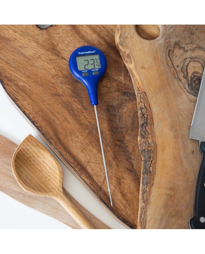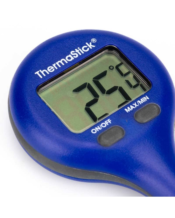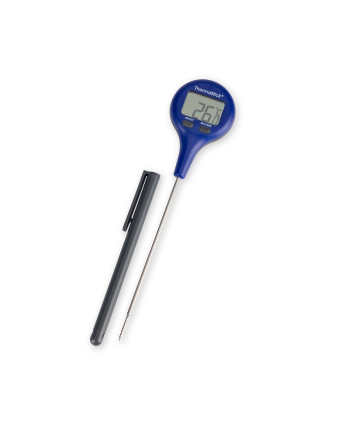 ThermaStick-termometern mäter temperaturen i intervallet -49,9 till 299,9 °C med en upplösning på 0,1 °C/°F och har två lättanvända tryckknappar, på/av och max/min.