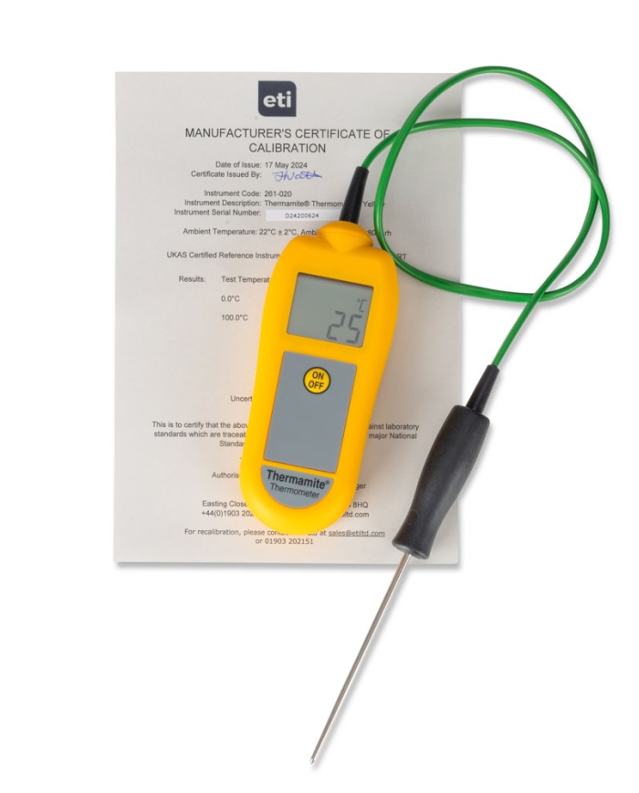 ETI Thermamite® HACCP-termometer – gul. Inklusive nålgivare med kabel. -50 to 300°C. Kalibreringscertifikat.