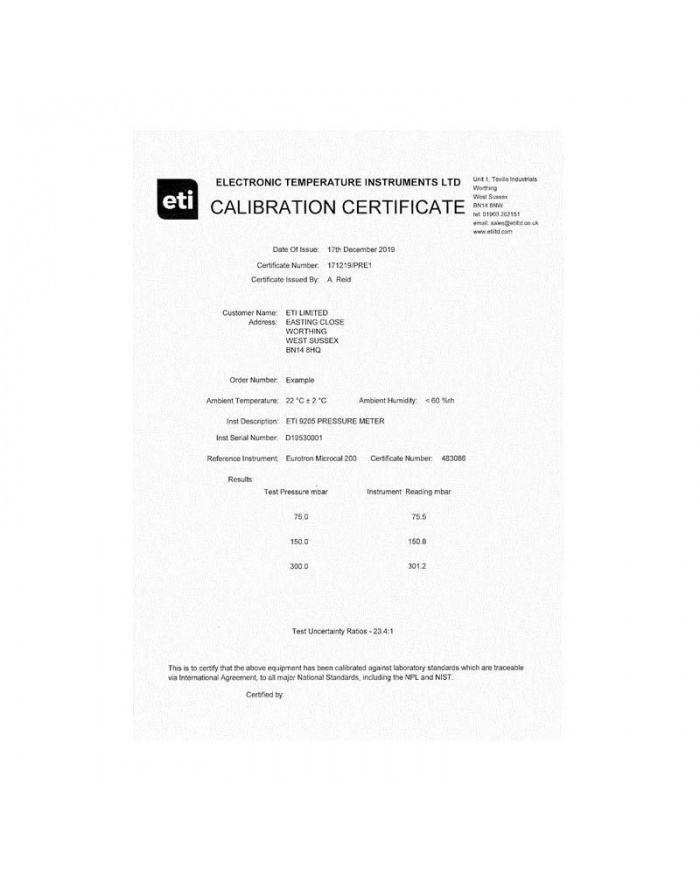 ETI Kalibreringscertifikat UKAS, 3 punkter, köps till vid beställning av manometer